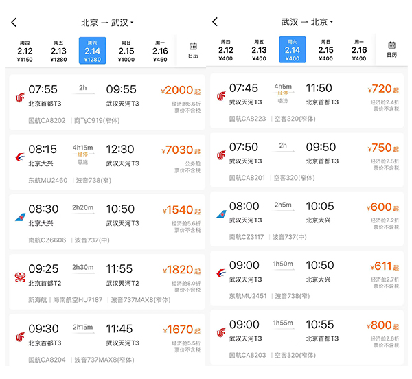 以1月30日价格为例,铁路12306平台显示2月14日从北京到武汉的经济舱票价千元不等,而“反向出行”票价优势显著。(图片截取自铁路12306客户端)